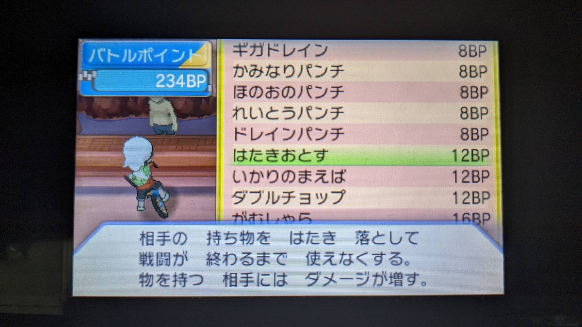 相手が毒ガスを撒いてきたので、2ターン目に空元気を選択したと思ってたのだが、何故か瓦割りを選択していて相手のエースを倒せずこちらの泥棒エースのメリープが倒れる。